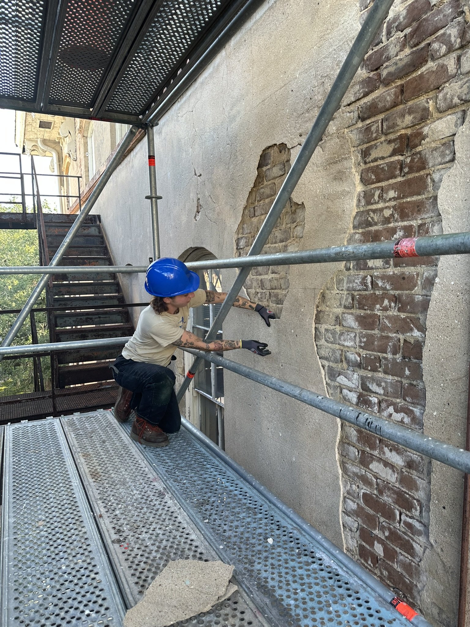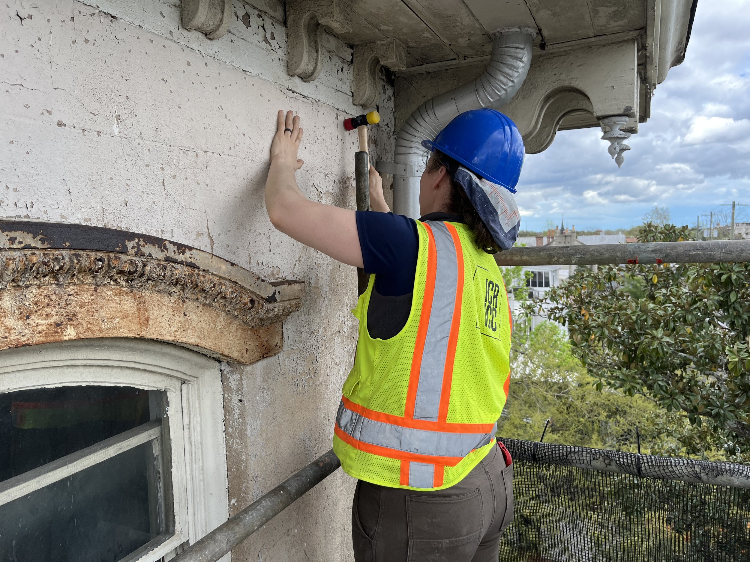 The team starts by establishing what historic materials are present and what condition they are in. At Noble Hardee House, materials include brick, stucco, cast iron, wood, and sandstone, and that is only on the exterior of the building!