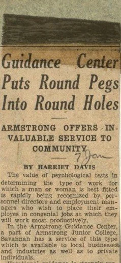 Bull Street looking South toward Forsyth Park c. 1935, after the Bull st. entrance was installed. Courtesy the Georgia Historical Society , GHS 1360-PH-11-19-05Article about the Veterans Guidance Center based in the basement of the Hunt Building when Armstrong Junior College owned the buildingStudents outside of the Hunt BuildingArmstrong Junior College (1945-1960)
