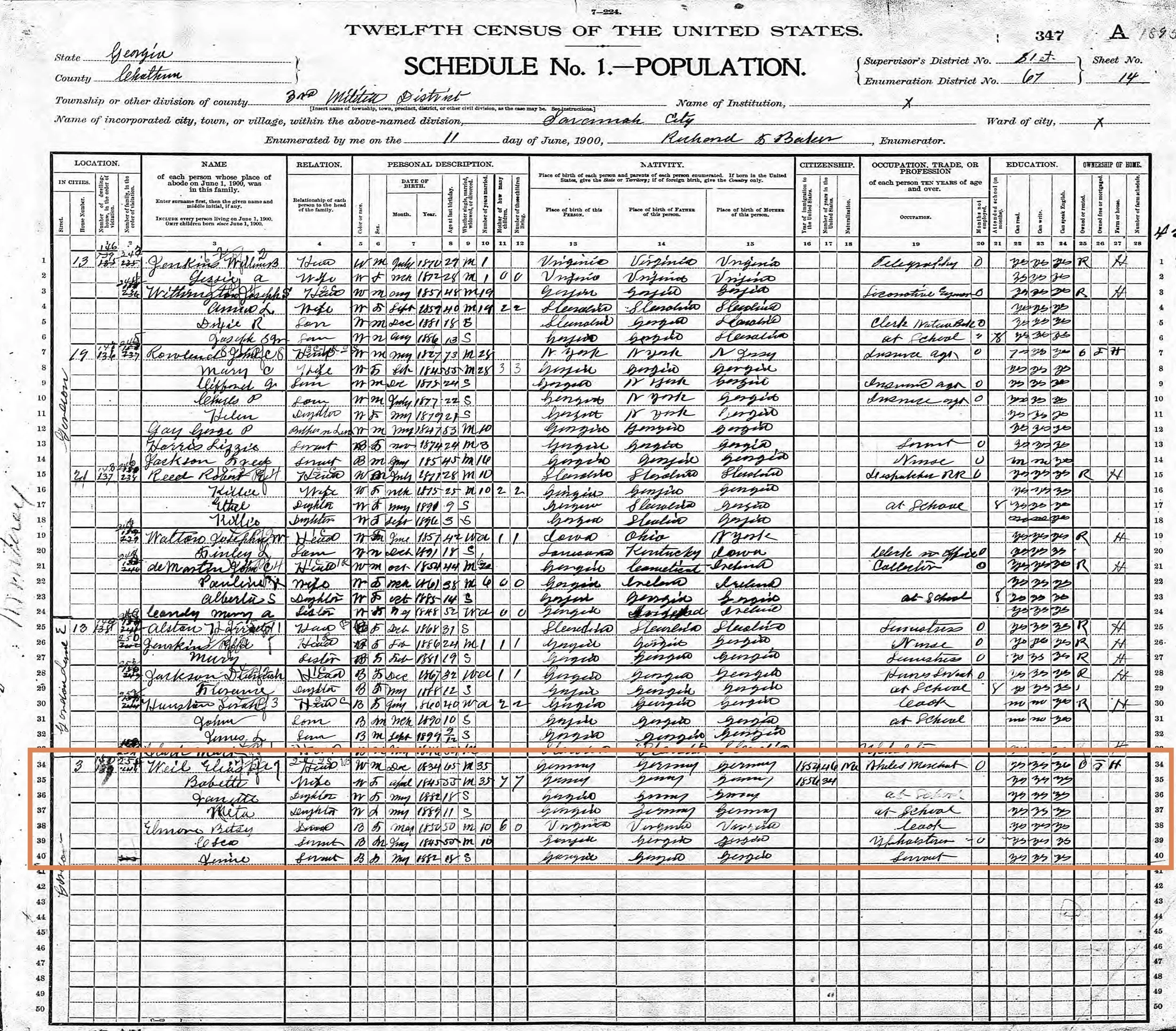 Federal census from 1900 showing the Weil family residing at 3 West Gordon and three Black servants with the last name Elmore (Betsy, Jemie, and a male servant with an illegible name)Single Family Home (1884-1907)