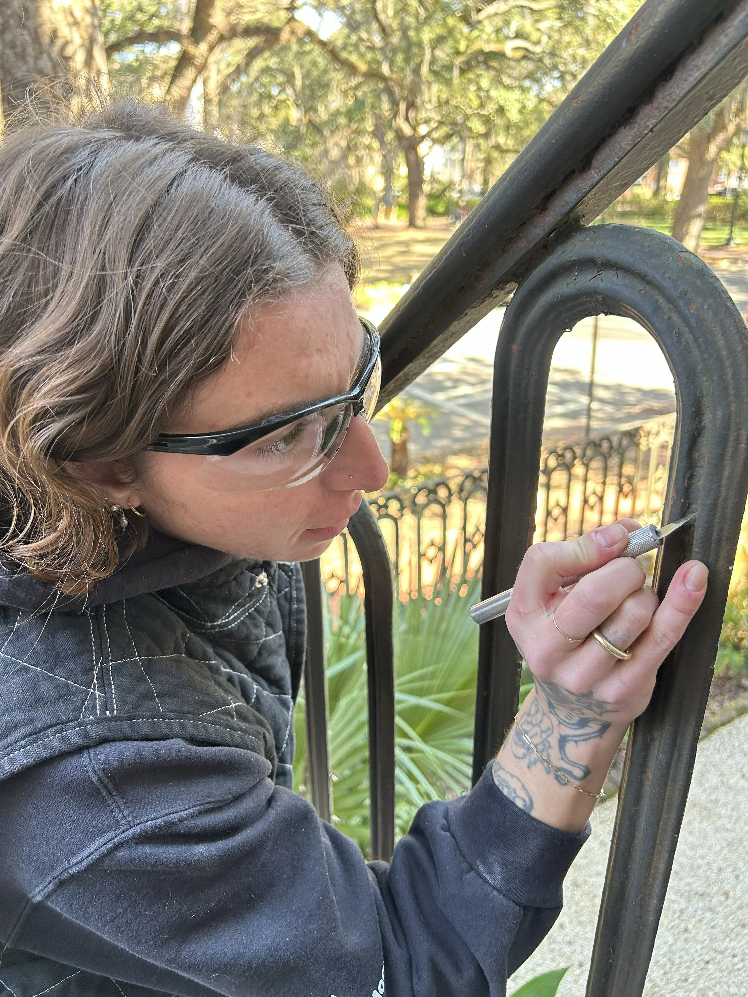 The team can gain significant information about the building without having to remove any historic materials. Non-destructive evaluation techniques used so far at the Noble Hardee House include moisture mapping, borescope investigation, and sounding to indicate underlying conditions. These techniques can help the team understand how widespread a given condition is and indicate the best location for probes and sample extraction.