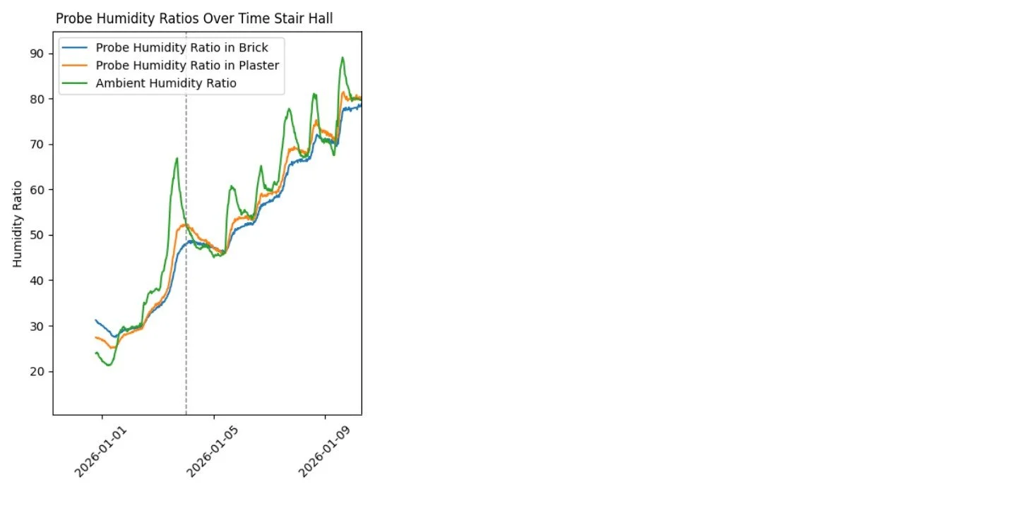 Conditions at the Noble Hardee House indicate that there are environmental impacts that have had a negative effect on the structure over time. Understanding the specific way the building responds to the local climate is essential to prioritizing conditions and designing long term compatible solutions. A site-specific environmental monitoring campaign was designed and installed in strategic locations throughout the building. The data from this system will be analyzed and utilized in a number of ways. Stay tuned for more on this.