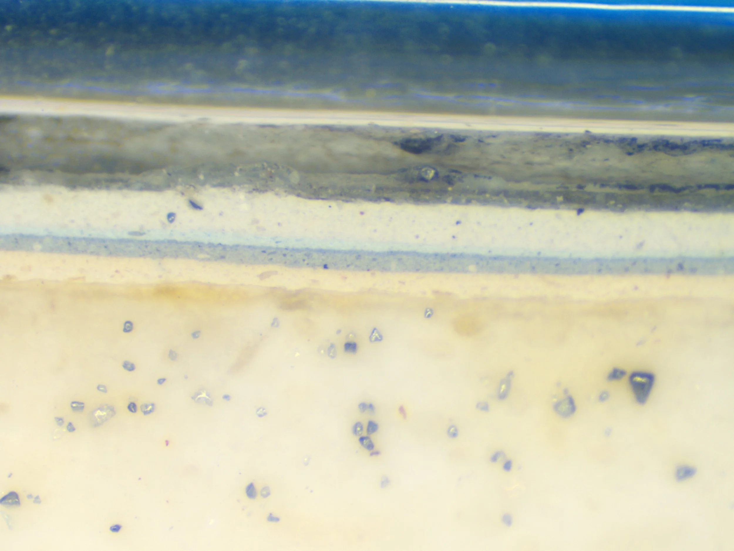 Removing representative material samples for off site analysis is an important step to characterizing historic materials, understanding their component parts, identifying current conditions, and making decisions about their repair or replacement. Small representative samples are removed from discrete locations on the building to be viewed under magnification and analyzed in a laboratory. Mortar analysis, petrography, finishes analysis, and wood identification are just a few of the analysis methods that are being implemented at the Noble Hardee House. Seen to the right is a representative paint sample (45x magnification) shown in cross section from one of the interior walls of the Noble Hardee House.
